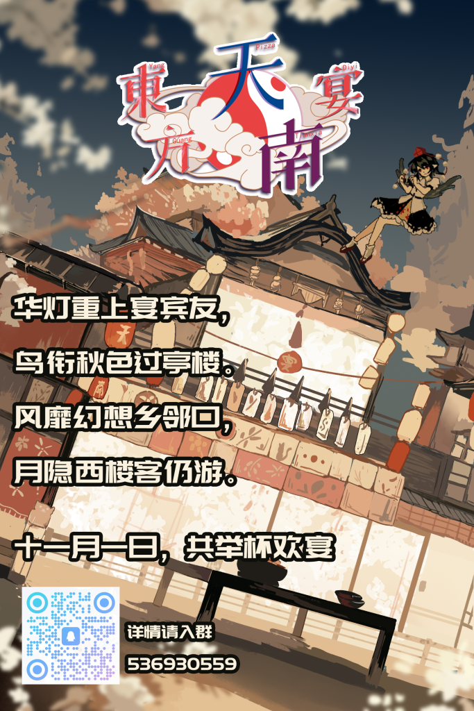 在大家的殷切期盼之下,2025秋东方天南宴将与大家见面啦! 载歌载舞,宴请八方。无论是STG大触,还是FTG高手;无论是钟情一设知识,还是博览二创游戏;无论你是沉浸东方幻想的体验,又或者只是单纯想与东方同仁共游这欢宴之中——只要心存幻想,此处便是一展东方热情的舞台。知识问答、卡牌桌游……你总能找到适合自己的活动。还等什么,快来与我们一同举杯欢宴吧!